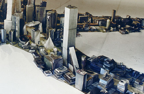 Cityscape 1 is based on the background of the practise of painting. It tries to explore the relationship of the subconscious, formless aspect of the use of colour and the constructed and well organised space of urban architecture. I built a raw architectural model of a fictive city (based on London) out of simple paper on which I sprayed coloured water through which the paper architecture partly collapsed and reshaped. The result was a city-model in decay.