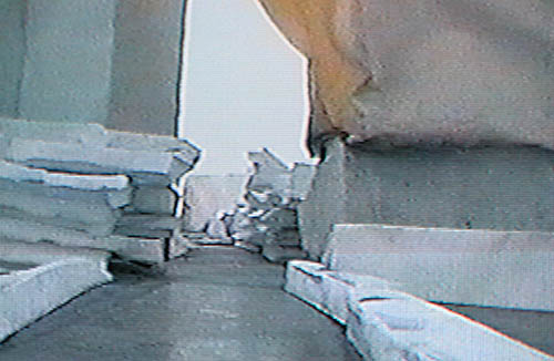 The videoloop Drift is a fast record of a journey through the streets of the mini-architecture of Cityscape 1 filmed by a small camera fixed on a Matchbox car.