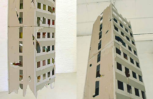 Die Arbeit Fragment ist das Modell eines abgewrackten Wohnturms im Stil des sozialen Wohnungsbaus. Kopfüber, seiner Bodenhaftung beraubt und wie entblößt, wurde es an einem Haken 40 cm über dem Boden aufgehängt. Die Öffnungen der Fenster und die Zerstörungen der Fassade geben den Blick auf die verlebten, farbigen Innenräume frei.
