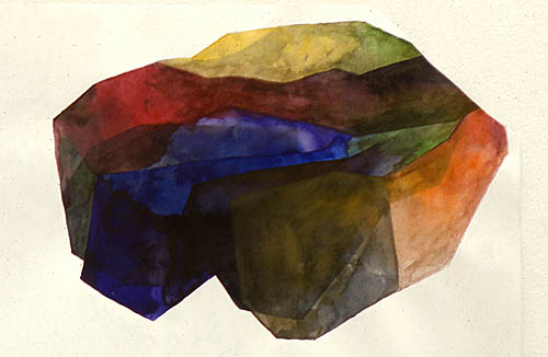 The drawings are simulations of fossilization, or crystallization using watercolour on a simple piece of paper. My aim was for the substance of the watercolour to be transformed in a very direct and immediate way. I was trying to give form to a certain sensual weight which we relate to every experience of colour and light. It finds it expression in these forms acting inbetween flatness and the illusion of three-dimensionality in which the colour finds its form in some kind of accidental, gem-like, geological shape.