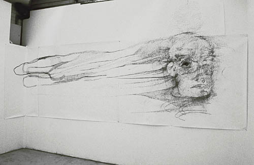 Experimentelle Großzeichnung. Ausgangspunkt war die Vorstellung nicht meinen Kopf selbst sondern den Raum der meinen Kopf umgibt aufzuzeichnen. In die Schnittstelle zwischen taktilem Empfinden der eigenen körperlichen Oberfläche und der Vorstellung eines von dessen Präsenz beeinflussten Raumes setzte ich auschließlich gestrichelte Linien, die nach und nach die Form (m)eines Kopfes hervorbrachten.