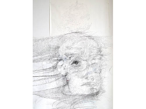 Kopfraum Experimentelle Großzeichnung. Ausgangspunkt war die Vorstellung nicht meinen Kopf selbst sondern den Raum der meinen Kopf umgibt aufzuzeichnen. In die Schnittstelle zwischen taktilem Empfinden der eigenen körperlichen Oberfläche und der Vorstellung eines von dessen Präsenz beeinflussten Raumes setzte ich auschließlich gestrichelte Linien, die nach und nach die Form (m)eines Kopfes hervorbrachten.
