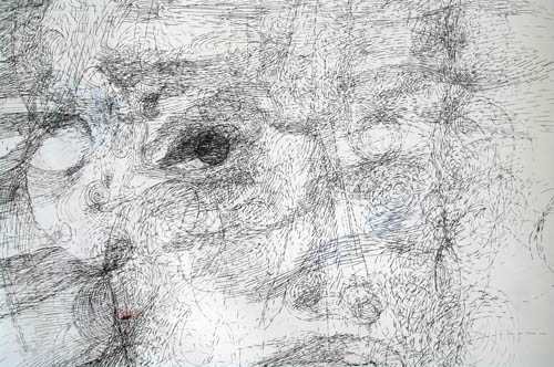 Experimentelle Großzeichnung. Ausgangspunkt war die Vorstellung nicht meinen Kopf selbst sondern den Raum der meinen Kopf umgibt aufzuzeichnen. In die Schnittstelle zwischen taktilem Empfinden der eigenen körperlichen Oberfläche und der Vorstellung eines von dessen Präsenz beeinflussten Raumes setzte ich auschließlich gestrichelte Linien, die nach und nach die Form (m)eines Kopfes hervorbrachten.