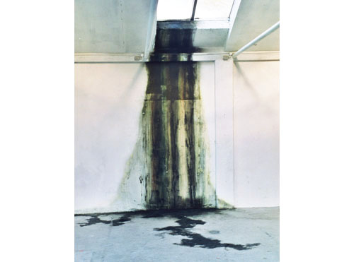 Leck Bei der Arbeit Leck hat mich die Simulation von Verfall anhand realer Architektur interessiert. In zwei Gruppenaussstellungen versuchte ich mit Hilfe von Tinte und Wasserfarbe das Bild eines jahrelangen Wassereinbruchs herzustellen Leak The work „Leak“ was motivated by an interest to simualte a real situation of decay with real architecture. In two group exhibitions I created the picture of a long lasting water leakage in the exhibition space