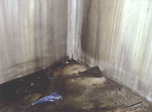 Leck Bei der Arbeit Leck hat mich die Simulation von Verfall anhand realer Architektur interessiert. In zwei Gruppenaussstellungen versuchte ich mit Hilfe von Tinte und Wasserfarbe das Bild eines jahrelangen Wassereinbruchs herzustellen Leak The work „Leak“ was motivated by an interest to simualte a real situation of decay with real architecture. In two group exhibitions I created the picture of a long lasting water leakage in the exhibition space