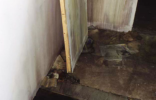 Bei der Arbeit Leck hat mich die Simulation von Verfall anhand realer Architektur interessiert. In zwei Gruppenaussstellungen versuchte ich mit Hilfe von Tinte und Wasserfarbe das Bild eines jahrelangen Wassereinbruchs herzustellen