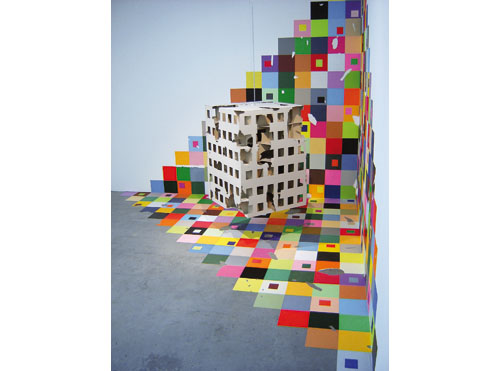 Ein halb zerstörtes Pappmodell eines modernistischen Wohnblocks hängt mit einer Kette an einem Drehmotor, der an der Decke des Ausstellungsraums befestigt ist. Durch die zerstörte Struktur scheint, verursacht durch die langsame Drehung des Modells, immer wieder die aus farbigen Papierquadraten bestehende Wandcollage hindurch. Das Modell wirkt skulptural, wie eine herabgelassener Lüster, vor einem Interieur, das selbst wie ein wie ein aus dem Ausstellungsraum herauschgeschnittenes Fragment wirkt.