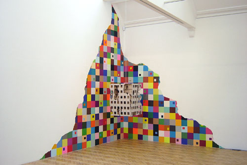 Lüster Ein halb zerstörtes Pappmodell eines modernistischen Wohnblocks hängt mit einer Kette an einem Drehmotor, der an der Decke des Ausstellungsraums befestigt ist. Durch die zerstörte Struktur scheint, verursacht durch die langsame Drehung des Modells, immer wieder die aus farbigen Papierquadraten bestehende Wandcollage hindurch. Das Modell wirkt skulptural, wie eine herabgelassener Lüster, vor einem Interieur, das selbst wie ein wie ein aus dem Ausstellungsraum herauschgeschnittenes Fragment wirkt. Lustre The cardboard model of a modernist, tower-like housing structure is hung from the ceiling of the exhibition space. The model went through a serious process of destruction and is now presented with its scarfs and holes exposed hanging on a metall wire which is connected with a small motor. The model works as sculpture, positioned in a way like a low hanging chandelier. On the other hand, the scultpure is a model of destroyed architecture, echoed by the collage which in its gesture is cutting off a piece of the architecture of the exhibtion space.