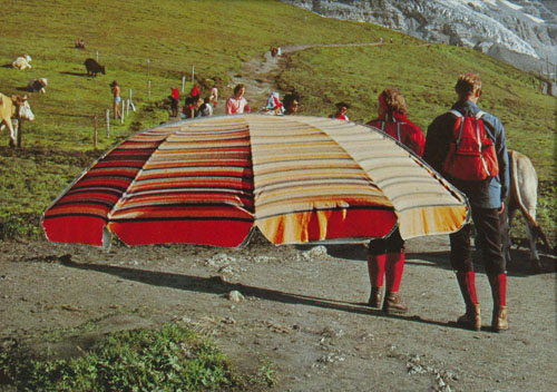 Der Titel der Serie „Negative“ bezieht sich einerseits auf das Medium andererseits auf den Arbeitsprozeß. Die Fotos aus den Bildbänden basieren noch auf der analogen Fotografie, also auf Negative. Wie bei den Foto-Interventionen reiße oder schneide ich Elemente aus dem Foto heraus. Doch wird in dieser Serie der Raum nicht hinterlegt oder offen gelassen sondern das Ausgeschnittene gewendet und mit transparentem Klebeband fixiert, so daß Bildelemente, die auf der Rückseite der Fotos gedruckt sind, zufällig „ins Bild fallen“ und damit neue und irritiernde Bild- und Raumkonstellationen zustandekommen, die das Fotomaterial aus seinem klischeeebeladenen Kontext befreit.