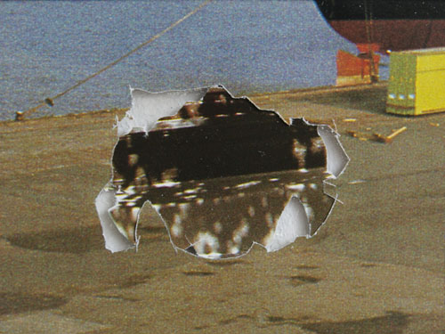 Der Titel der Serie „Negative“ bezieht sich einerseits auf das Medium andererseits auf den Arbeitsprozeß. Die Fotos aus den Bildbänden basieren noch auf der analogen Fotografie, also auf Negative. Wie bei den Foto-Interventionen reiße oder schneide ich Elemente aus dem Foto heraus. Doch wird in dieser Serie der Raum nicht hinterlegt oder offen gelassen sondern das Ausgeschnittene gewendet und mit transparentem Klebeband fixiert, so daß Bildelemente, die auf der Rückseite der Fotos gedruckt sind, zufällig „ins Bild fallen“ und damit neue und irritiernde Bild- und Raumkonstellationen zustandekommen, die das Fotomaterial aus seinem klischeeebeladenen Kontext befreit.
