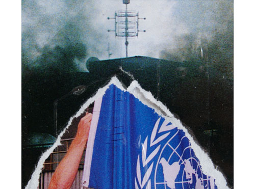Der Titel der Serie „Negative“ bezieht sich einerseits auf das Medium andererseits auf den Arbeitsprozeß. Die Fotos aus den Bildbänden basieren noch auf der analogen Fotografie, also auf Negative. Wie bei den Foto-Interventionen reiße oder schneide ich Elemente aus dem Foto heraus. Doch wird in dieser Serie der Raum nicht hinterlegt oder offen gelassen sondern das Ausgeschnittene gewendet und mit transparentem Klebeband fixiert, so daß Bildelemente, die auf der Rückseite der Fotos gedruckt sind, zufällig „ins Bild fallen“ und damit neue und irritiernde Bild- und Raumkonstellationen zustandekommen, die das Fotomaterial aus seinem klischeeebeladenen Kontext befreit.