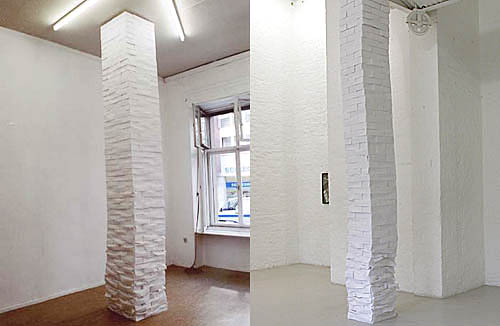 Aus A3 Kopierpapier gefaltete Ziegel formen eine Säule, die eine scheinbar stützende Funktion im Raum übernimmt. Durch das Eigengewicht des Papiers verformt sich die Arbeit während der Ausstellung erheblich. Täglich müssen neue Papierziegel nachgelegt werden.