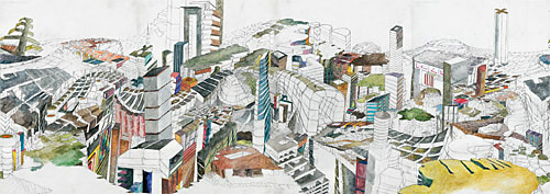 The drawing "View" shows a 360 ° panoramic scenery of a fictive city integrated in a mountainous landscape. As in Zora and in later drawings it relates architectural form to landscape formations, embedding the city in a context inbetween mind mapping and entropical transformation of topography.