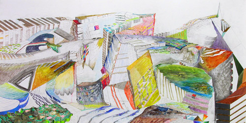 "Land" is an attempt to integrate gestural forms of painting in my drawing practice in order to discover new ways of generating complexitiy. Landscape formations and archictectural forms are fused with each other by reversing the approach: drawing painterly gestures and defining and contextualising painted gestures by drawing.