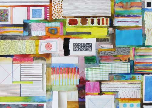 Diese Arbeiten auf Papier oder dünnem Karton lösen sich vom Darstellerischen der Stadt-und Landschaftsformationen zugunsten einer offenen, zyklischen Bewegung in der die Elemente wirken wie in einer Momentaufnahme im Prozess der Transformation. In anderen setzten sich Formen zu statischen Konstellationen zusammen angesiedelt zwischen architektonischer Anordnung und abstrakter Komposition. Der Bildträger Papier stellt für mich immer auch ein Objekt da, in das die Zeichnung „hineingearbeitet“, nicht aufgebracht wird. Es enstehen Risse und Löcher im Papier die zum Teil durch Papier- und Fotoschnipsel hinterlegt oder zugeklebt werden.