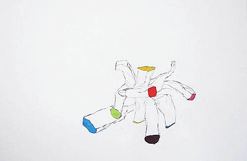 Diese Arbeiten auf Papier oder dünnem Karton lösen sich vom Darstellerischen der Stadt-und Landschaftsformationen zugunsten einer offenen, zyklischen Bewegung in der die Elemente wirken wie in einer Momentaufnahme im Prozess der Transformation. In anderen setzten sich Formen zu statischen Konstellationen zusammen angesiedelt zwischen architektonischer Anordnung und abstrakter Komposition. Der Bildträger Papier stellt für mich immer auch ein Objekt da, in das die Zeichnung „hineingearbeitet“, nicht aufgebracht wird. Es enstehen Risse und Löcher im Papier die zum Teil durch Papier- und Fotoschnipsel hinterlegt oder zugeklebt werden.