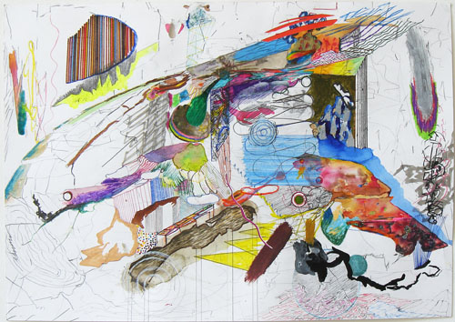 Diese Arbeiten auf Papier oder dünnem Karton lösen sich vom Darstellerischen der Stadt-und Landschaftsformationen zugunsten einer offenen, zyklischen Bewegung in der die Elemente wirken wie in einer Momentaufnahme im Prozess der Transformation. In anderen setzten sich Formen zu statischen Konstellationen zusammen angesiedelt zwischen architektonischer Anordnung und abstrakter Komposition. Der Bildträger Papier stellt für mich immer auch ein Objekt da, in das die Zeichnung „hineingearbeitet“, nicht aufgebracht wird. Es enstehen Risse und Löcher im Papier die zum Teil durch Papier- und Fotoschnipsel hinterlegt oder zugeklebt werden.